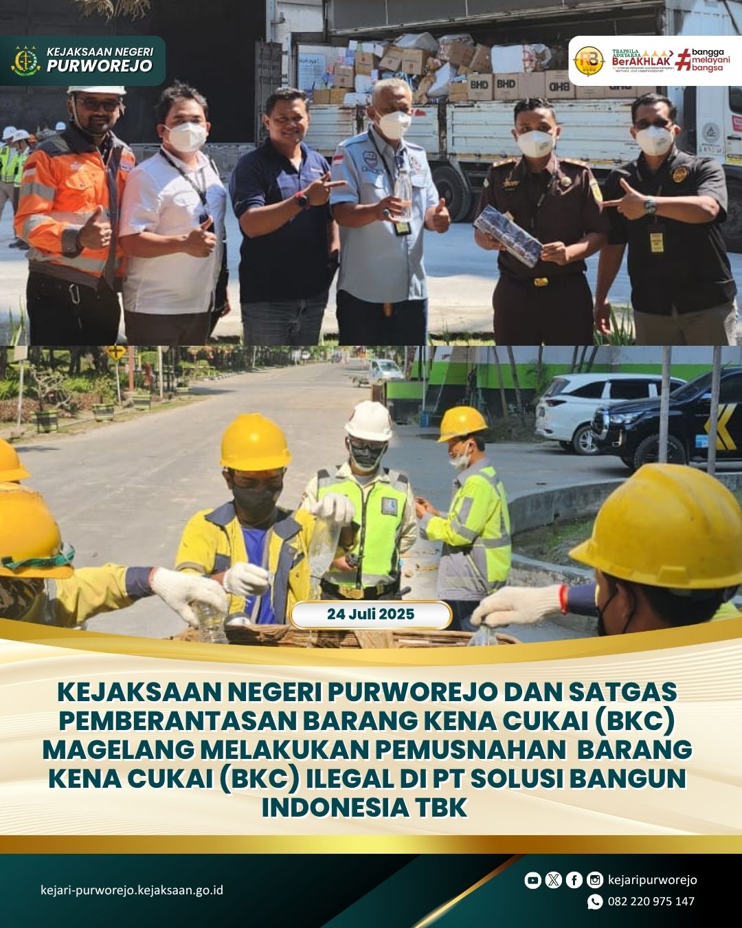 Pada hari Kamis, tanggal 24 Juli 2025 bertempat di PT. Solusi Bangun Indonesia (Nathabumi) Jl. Insinyur Haji Juanda, Padaramai, Karangtalun, Kecamatan Cilacap Utara, Kabupaten Cilacap, Jawa Tengah telah dilaksanakan Kegiatan Pemusnahan Barang Hasil Penindakan Satgas Pemberantasan Barang Kena Cukai (BKC) Ilegal di Wilayah Pengawasan Bea Cukai Magelang.